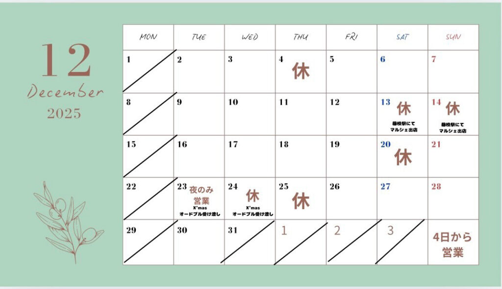 12月の営業日は下記のとおりです。また、土日祝日限定で9:00~10:30の時間に500円ワンコインのお手頃モ-ニングを実施してます。皆様のご来館ご利用をお待ちしてます。
