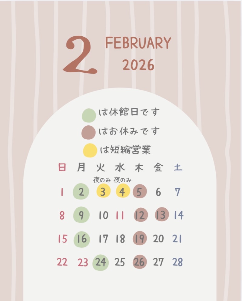 2月の営業日は下記のとおりです。また、土日祝日限定で9:00~10:30の時間に500円ワンコインのお手頃モ-ニングを実施してます。皆様のご来館ご利用をお待ちしてます。