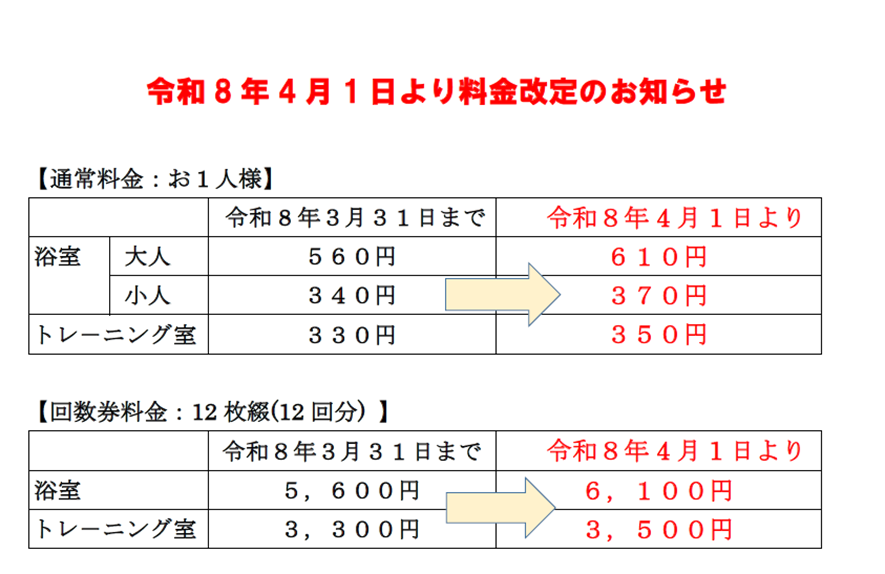 近年の物価高騰や人件費増加等の社会情勢を背景に、令和8年4月1日より浴室とトレ-ニング室の料金を改定をさせて頂きます。何卒ご理解の程宜しくお願い申し上げます。